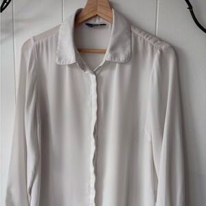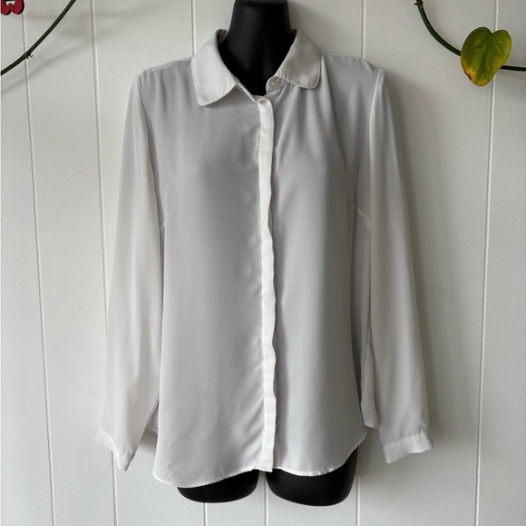 This elegant top from showcases a crisp white hue and a charming peter pan collar, perfect for adding a touch of sophistication to any outfit. The buttoned style and relaxed fit make it a versatile choice for both professional and casual occasions.