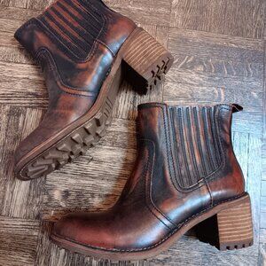 Awesome vintage styling with these Rocket Dog Max Edward size 7 in Chocolate Burnout Leather. New without tags. Genuine leather upper. Beautiful burnished reddish brown with dark brown mottling, gorgeous distressed look. Rubber lug soles with a block heel 2.5" high. Shaft is about 4.5" high. Pull on style with leather goring panels on both sides. Sz 7.