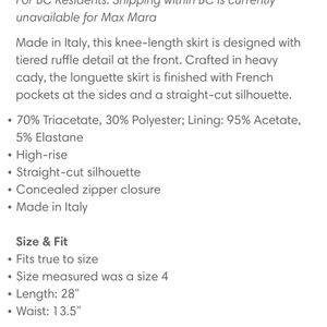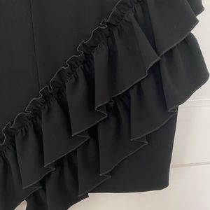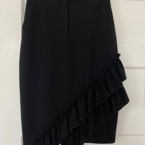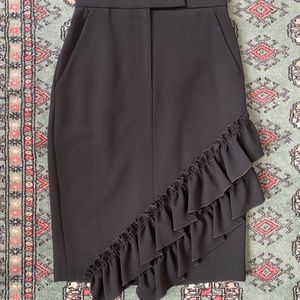 Made in Italy, high rise, straight cut silhouette. Very elegant and the tiered ruffled details add a bit of fun. Concealed zipper closure. In immaculate condition. No flaws. See pic for more product details.