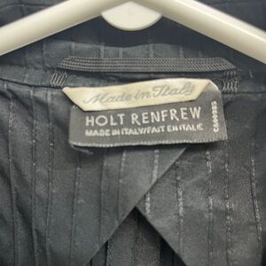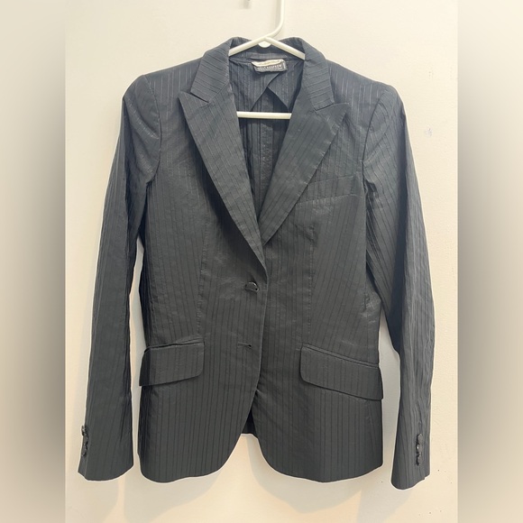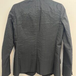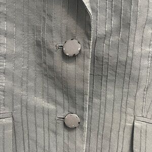 Beautiful silk blend jacket with textured vertical lines, hip pockets, chest slash pocket, acrylic buttons. Excellent condition.