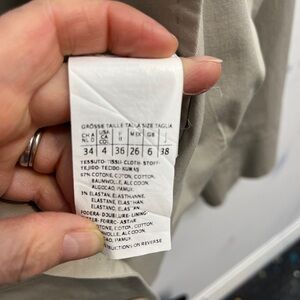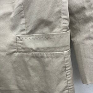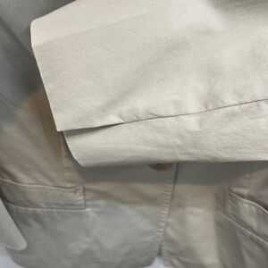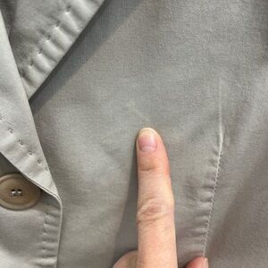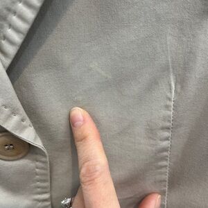 Lightweight single-breasted cotton blend jacket with hip pockets and top stitching details. Slashes at forearms. 3 slightly lighter areas as indicated in photos (price reflects)