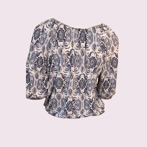 Keywords: Max Studio, Floral Lace Up Top, White, Blue Paisley Print, Lace Up Detail, Long Sleeves, V-Neckline, Casual, Elegant, Stylish, Perfect for Any Occasion