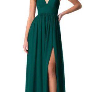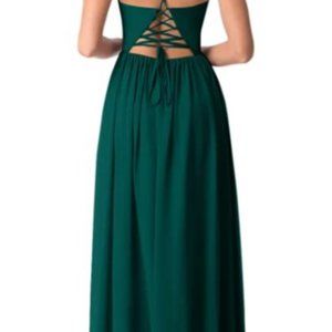 Pine green dress with deep V cut neckline and corset back. Thought to be worn as a bridesmaid dress but I decided on another dress. Tags remain intact and was never wore!!