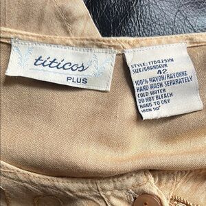 Vintage Titicos Plus dress in golden rayon with allover tonal embroidery. Full-length silhouette with front button detail, short sleeves, and a gently scooped neckline. Unlined, lightweight, and ultra breathable. Soft, drapey feel with room to move.