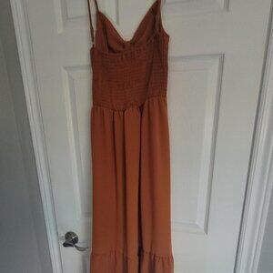 Rusty brown Summer maxi dress with keyhole detailing at chest and smock back for stretch & comfort.