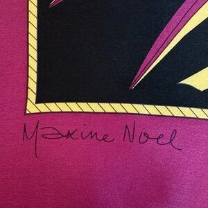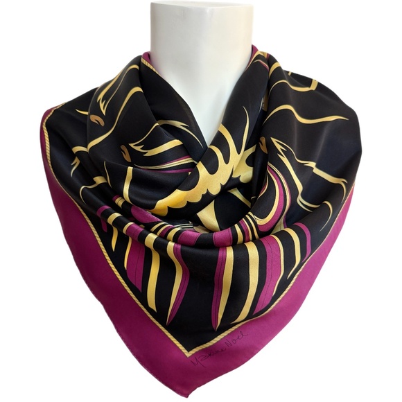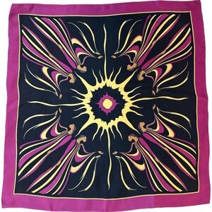 This luxurious silk scarf was designed by Maxine Noel (Sioux Nation) for Oscardo, a Canadian brand known for supporting Indigenous artists. The bold design features flowing figures radiating from a glowing sunburst, in a striking palette of black, magenta, and golden yellow with a vivid pink border. At 31” square, it’s the perfect size to wear as a neck scarf, headscarf, or statement accessory.