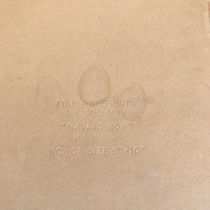 Set of 2 vintage art prints by Maxine Runci, "Navajo Doll" and "Navajo Boy". Prints are 8x10" on cardboard with textured finish. Back of print is embossed with "Fine Art Prints by Gellman" and art print name. Pre-owned, vintage condition: has some marks to backing and wear to edges.