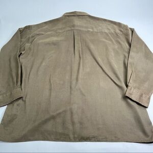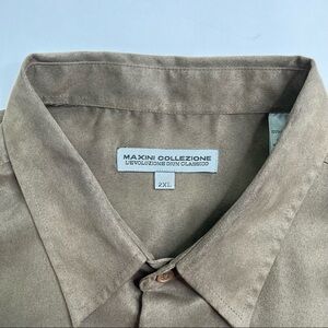 Maxini Collezione brown/green 100% microlon ultra suede long sleeve collared dress shirt with two working pockets on the front. A very soft luxurious feeling suede! In excellent used condition with no flaws. Please see photos and video for measurements and details. Men's size XXL (2XL).