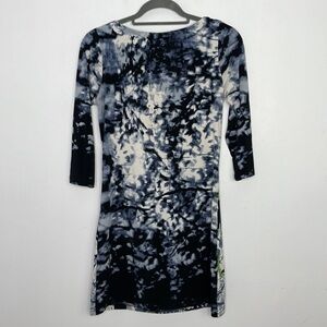 In good second hand condition slight discoloration around the armpit but not very noticeable when it's worn. Not fabric tag. Stretchy lightweight fabric. Abstract artsy paint splash print. 3/4 sleeve. Measure lay flat: shoulder 14'' bust 18,5'' waist 15,5'' hips 17'' length 33'' sleeve length 17,5''. Sold as it.