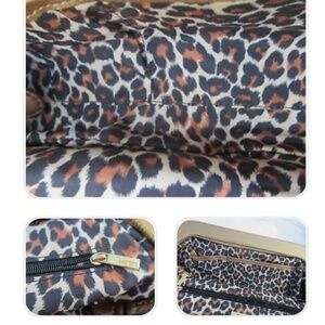 The back has a zippered pocket with the animal print fabric lining and a longer zippered leather pull.