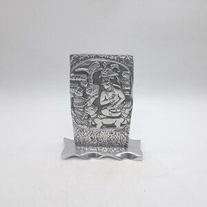 An aluminum depiction of the coronation of the Mayan Ajaw Pakal, king of Palenque. The king is sitting down with what look to be a jaguar and a dog facing different directions beneath him. Someone, presumably a deity or priest, holds a crown (in this case a headdress) that he is about to place on Pakal's head.