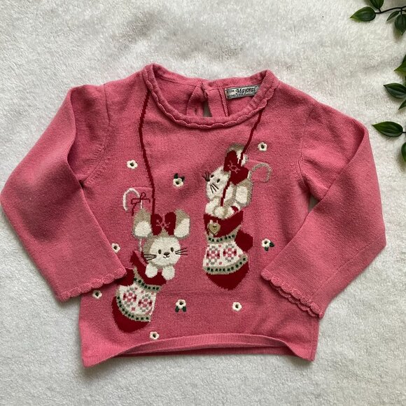 Mayoral baby sweater set, 12M pink mouse sweater, holiday stocking graphic sweater, navy dog sweater bonus, GUC baby girl clothes, Mayoral toddler knit, 12 months winter sweater, button back baby sweater, Poshmark kids clothing, Christmas baby outfit, cozy toddler layer, pre-loved 12M