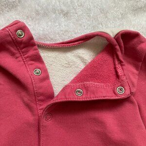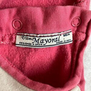 Pink toddler dress from Mayoral, size 12 months. 95% cotton, 5% elastane. Charming village print with a ruffled hem and long sleeves in a contrasting pink shade.