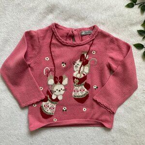 Toddler baby sweater set from Mayoral, size 12 months. The pink sweater features a mouse and stocking design, in great pre-loved condition. No stains or rips, though missing the material tag.