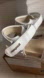 Chic white sandals with ruched front. Adjustable straps for comfort.