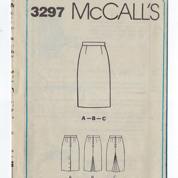 This is McCall's Straight Skirt Pattern 3297 from 1987 in Size D (12, 14, 16). The style is quite timeless. Straight skirt A, B, or C has front and back darts, back zipper opening and waistband. Skirt A has buttoned back vent. Skirt B has pleated back vent. Skirt C has back godet* cut bias. It has cutting lines for all three sizes in one.