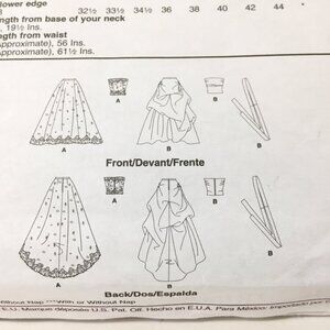 The pattern is a costume can be a wedding dress or gown or for an amazing cosplay costume. It is a lined top, skirt and sash. It is close fitting with or without boning. There are flared options. The pattern is 12 pieces.