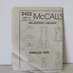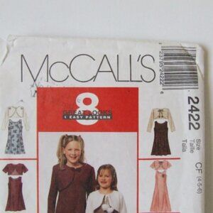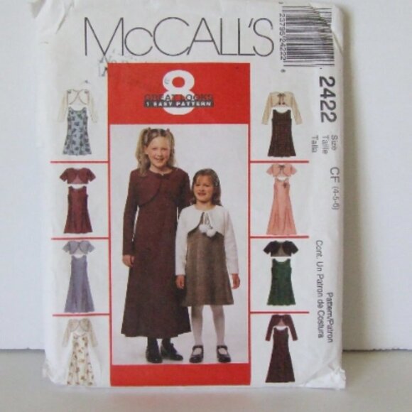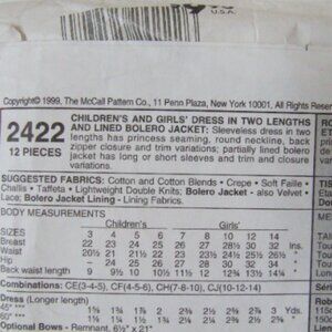 Uncut McCall's sewing pattern 2422. Printed in 1999. Girls sizes 4, 5, and 6. Dress with bolero style jacket in 8 variations. The recommended fabrics include cotton, crepe, and taffeta.