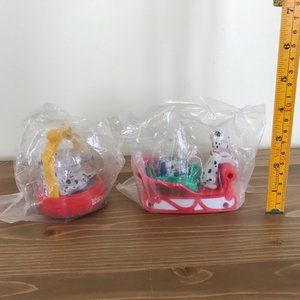 Set of 2 McDonald's 101 Dalmations collectible Christmas-theme snow globe figures, from 1996. Sleigh figure is approx. 4" long x 3" high x 2 1/2" wide, Present figure is approx. 3 1/2" tall x 3" wide. Both are still sealed in the original plastic bags.