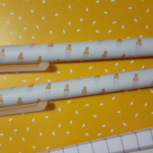 Sesame seed bun note book and french fries note book with two ice cream cone pens.