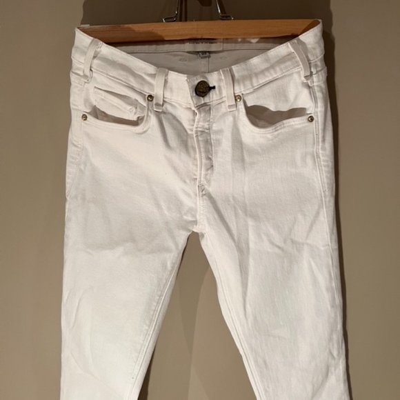 These white cotton-blend denim skinny jeans were made in Los Angeles, USA. They feature frayed raw-cut hems, detailed tonal stitching on the back pockets, an antique single-button closure, and a zip fly.