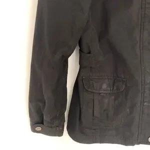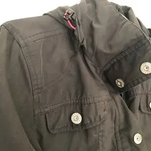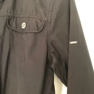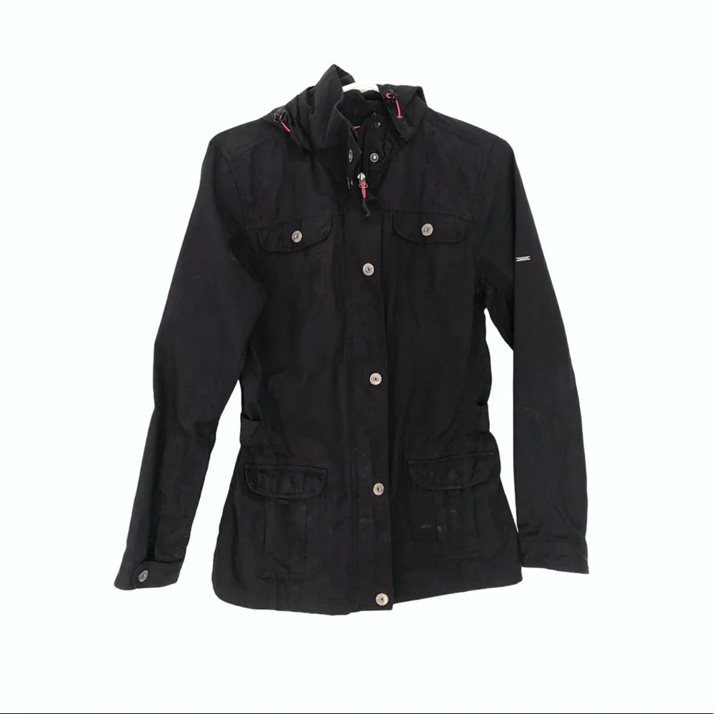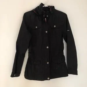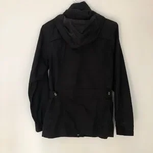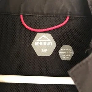 McKinley spring jacket in black. Cinch buttons for flattering waistline. True color shown in pictures 5/6. All zippers and buttons in working fashion. Hood is removable. Jacket is waterproof. Fits true to size. Comes from pet and smoke free home.