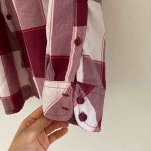 NWOT Lightweight McKinley button down top. Size small. Burgundy and white check with orange striping. The photo with the brand name is the most accurate depiction of the colour. Great for sun/bug protection in hot weather!