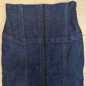 Absolutely pristine McQ by Alexander McQueen indigo denim corset waist pencil skirt - IT42 / US 6-8. Indigo denim, hook and eye corset-style waist. Back zip closure. Never worn, like new. 97% Cotton. 3% Elastane.