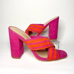 Add a pop of colour and elegance to your wardrobe with these dressy slip-on block heel sandals from Shoedazzle. Featuring chic crisscross straps, a trendy square toe, and a bold red and pink color combination, these heels are perfect for any occasion. The 4.75" block heel offers height and stability, making them ideal for weddings, nights out, or stylish brunches!