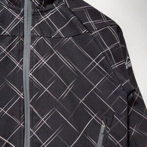Patterned full zip hooded jacket for snow, skiing, and the winter. Zippered pockets. Shell: 100% polyester. Condition: small white paint splatter in some areas, otherwise still functional.