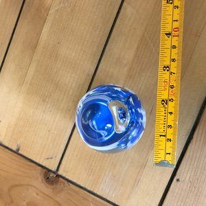 Hand blown studio art egg-shaped paperweight by Mdina. Controlled bubble flower design in blue & white with a few splashes of yellow, aqua & purple. Signed "Mdina" on bottom, has original studio sticker on the side. Approx. 3 1/2" tall x 2 1/2" at widest part. Good pre-owned condition, glass has a few irregularities due to being hand made (ie. a few tiny "pits" at the very top of egg shape).