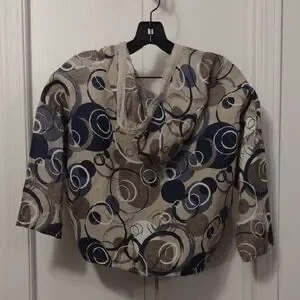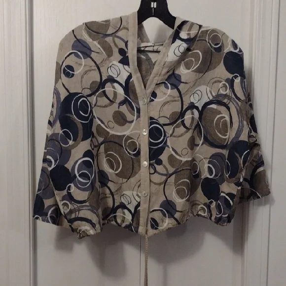 Vintage made in Italy linen, cute light jacket with abstract blue and tan colored patterns.