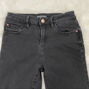 Black stretchy skinny jeans by Me & City. Zipper fly, rose gold hardware.