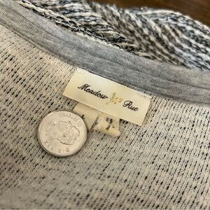 Chic tunic with black and white stripes. Features a relaxed fit and front pockets. Ideal for versatile styling.