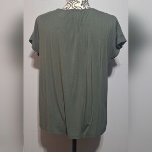 Chic olive blouse with V-neck. Features detailed short sleeves. Perfect for versatile styling.