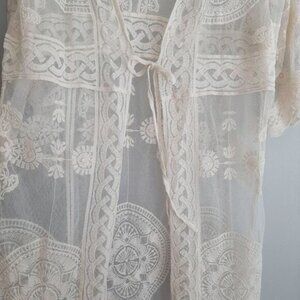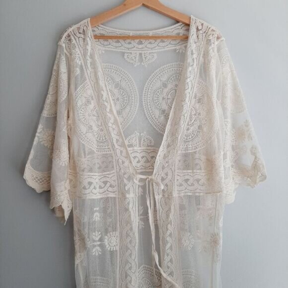 • Long 3/4 sleeve, long line, duster style cardi in ivory white all-over flower / botanical embroidered mesh. It can be won open front or tied with a tie in the font.