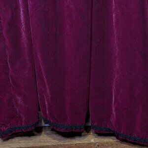 This medieval style vest is made of a reddish-purple velvet, with a lace trim down the front and around the hem. The lace is black, the six grommets are silver colors and the cord is black. At some point in its life it was taken in at the sides so measurements are given for its current size.