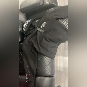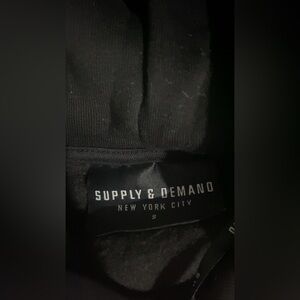 Black Hoodie Says Supply On Top Paint Splatter On Arm