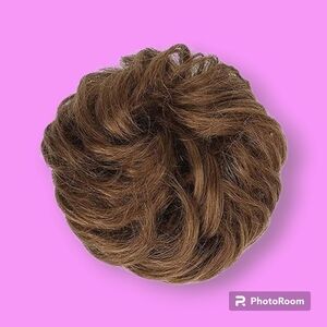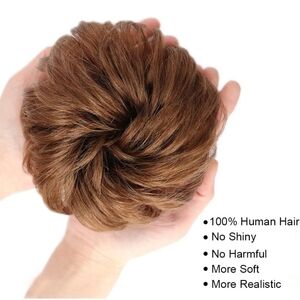 Medium warm brown messy bun made of 100% remy human hair. Just under 7" in length, weighing 35-40 grams. Since it's human hair, you can perm it, dye it & customize it to suit your hair & needs. Adds thickness & volume to your hair in an instant!