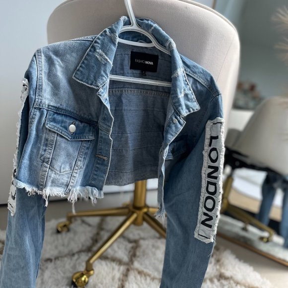 BRAND NEW FASHIONNOVA CROPPED JEAN JACKET with tags still on. Cute with patches of City Names on it.