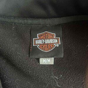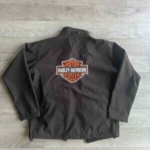 Stylish Harley-Davidson softshell jacket in classic black, perfect for cool rides. Please note the zipper slider is missing (the teeth are intact but it needs a new pull to fully close). Ideal for anyone handy with a quick repair or looking for a project piece with that iconic Harley flair.