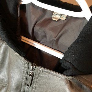 This jacket features grey faux leather with a black cotton/polyester hood. The zipper works great. Very good used condition.