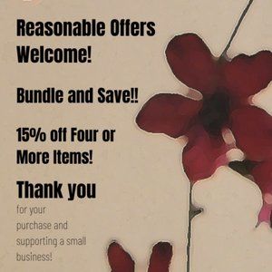 I accept reasonable offers anytime on secondhand goods and provide a 15% discount on bundles of 4 or more. I do not accept lowball offers, for example, 31-50% or more, and do not haggle as Poshmark’s fee is 20% and it becomes difficult to make a decent living. Lowball offers are respectfully denied or may not even be considered.