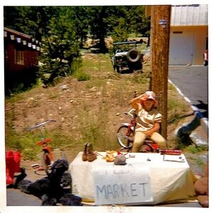 Photo of me in 1969 selling toys in our driveway in my first "Flea Market".