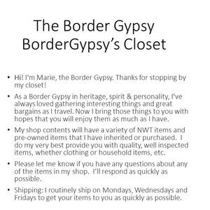 Hello Marie, Thanks for stopping. Offers Welcomed! A great platform to Buy and Sell discounted items. My Closet is offsetting the Buyer's cost. I have reduced all listings by 5% with bundles saving of 15% discount on purchases of 2 or more items with reduced shipping. Shop with confidence a Posh Ambassador II with a 4.9 Rating. A selection of Quality Items, Great Prices, Fast same or next day shipping and prompt Custom Service Communications. Be Well, Be Happy, Be Kind and Be Safe.