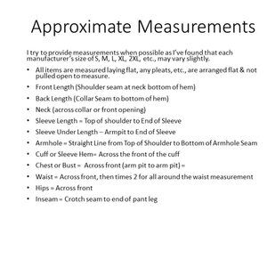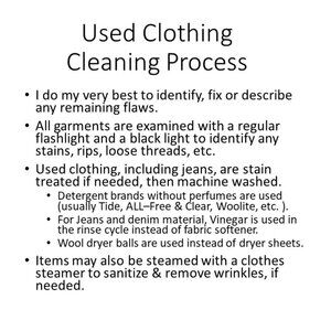 Please see photo for my Used Clothing Cleaning process and also the Approximate Measurements that explains how I measure clothes.