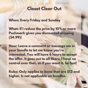 Hi Michelle, Thanks for the Follow, and A BIG Welcome to POSHMARK and my CLOSET. It's a great platform to buy / sell. Here's what to expect should you support my closet. Quality items, quick/reduced shipping, 15% off 2 or more items, and great customer service. LMK if you have questions about the Poshing process, I'd be happy to help. Saundra