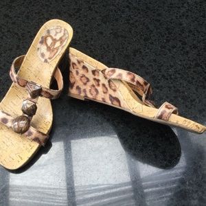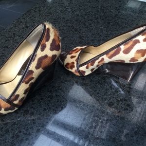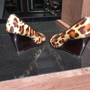 Faux fur, animal print shoes with a chocolate brown wedge heel. Excellent condition. Size 6.
