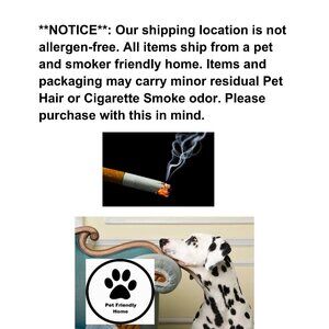 **NOTICE** Items ship from location not allergen-free. Items/Packaging may carry minor residual pet hair or cigarette smoke odor. Please purchase with this in mind.