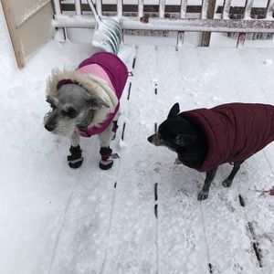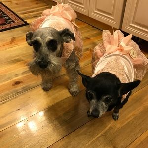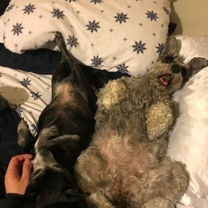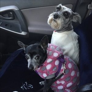 Hi our names are Veda (Schnauzer) and Millie (Chihuahua)! We are two classy dames! We like to help mom sell her poshmark so she will buy us new outfits! Veda has been with mom for 11 years but Millie just came in September she is a rescue with no teeth but that doesn't keep her from stealing Veda's kibble when she's not looking! Mom is making up for my hard life and spoiling me extra now! We come from a smoke free home and we promise you won't find our hair on anything but the bed!